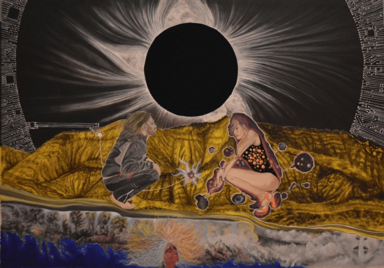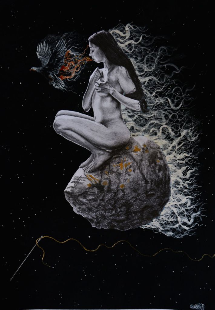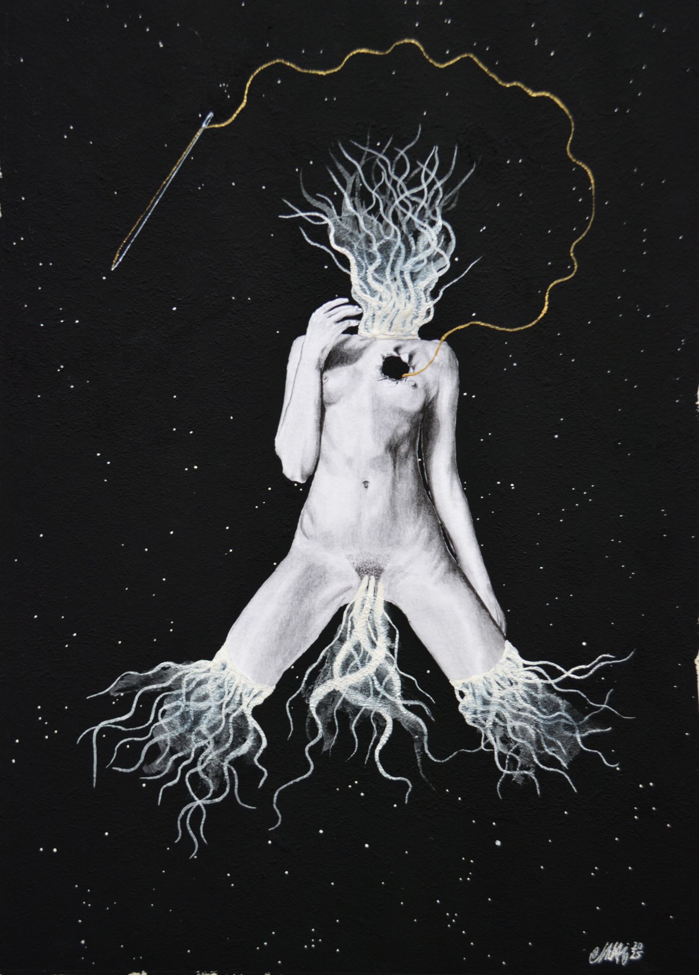 Lápices 4H, 2B, 4B, cartulina, pintura acrílica y acuarela, musou Black 99,4%, aguja y hilo.