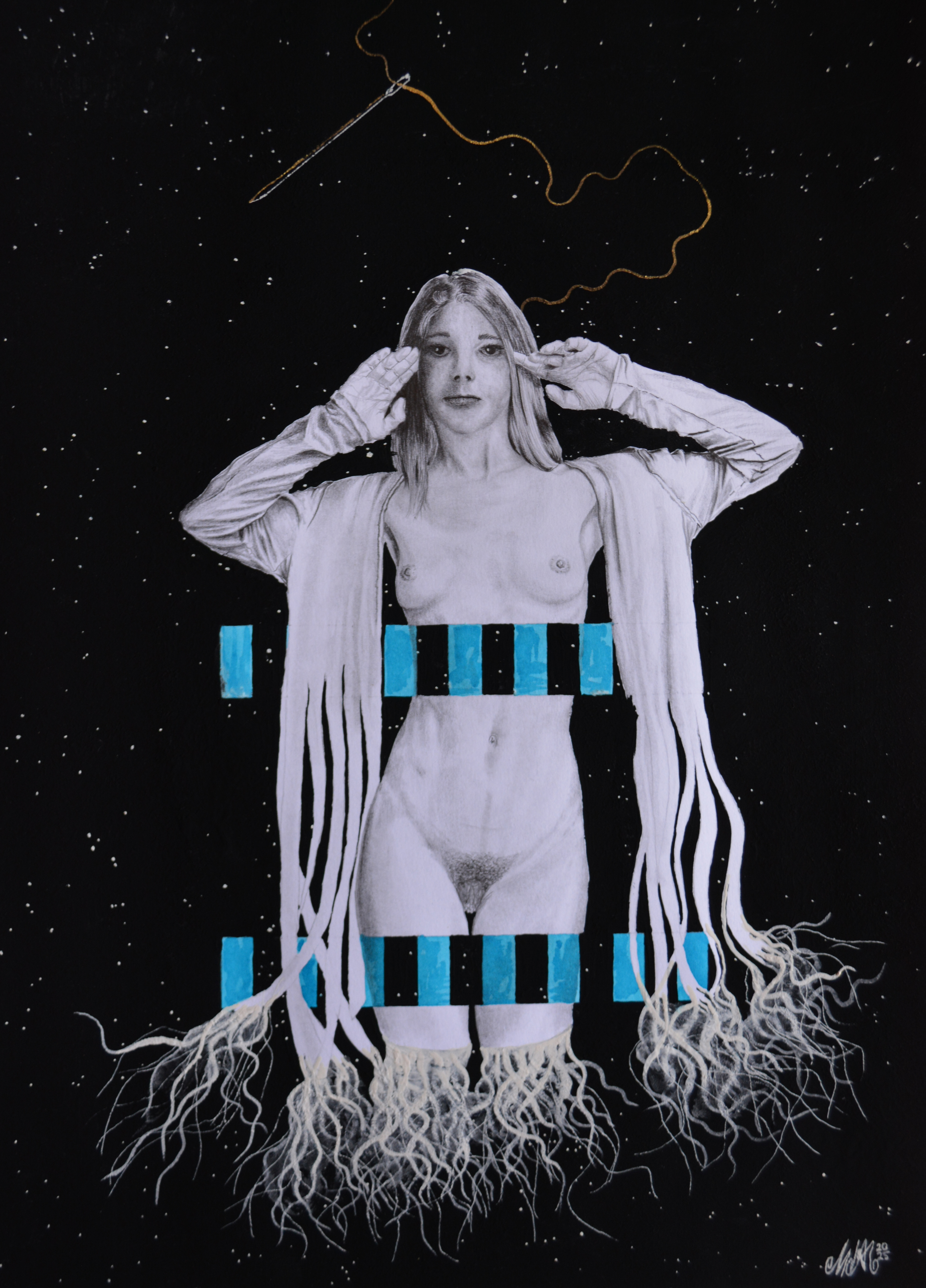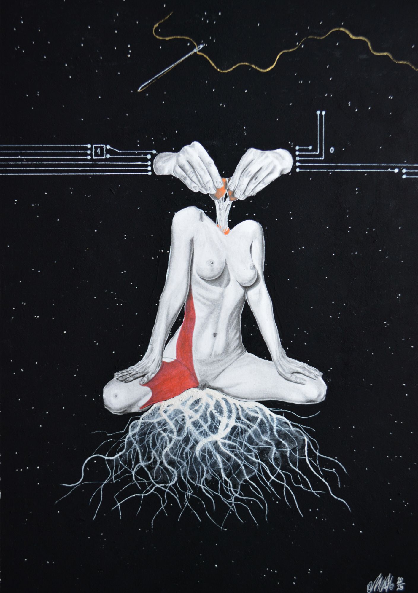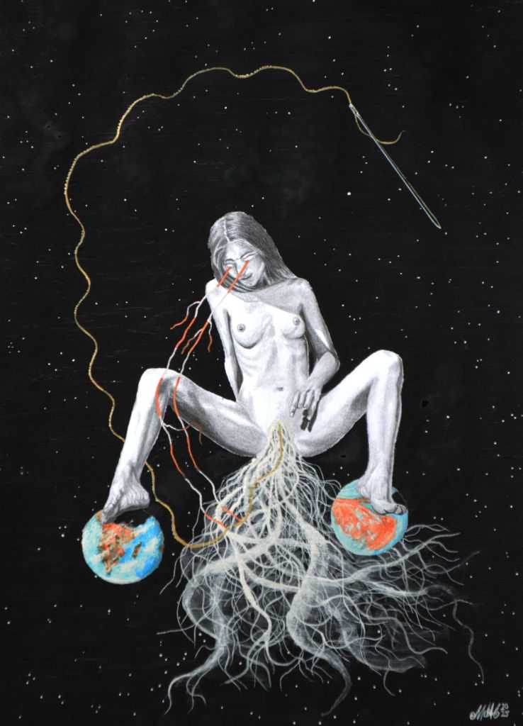 Lápices 4H, B, 3B, 8B, cartulina, pintura acrílica y acuarela, tinta roja, musou 99,4%, aguja y hilo. 40X30cm 2025