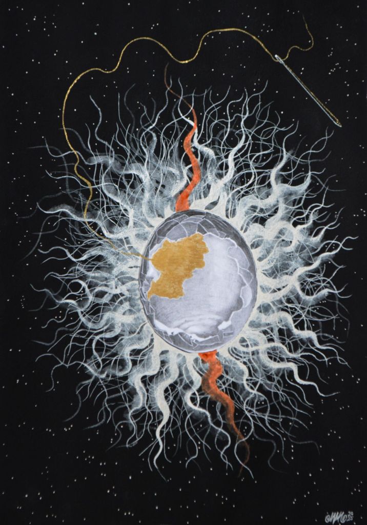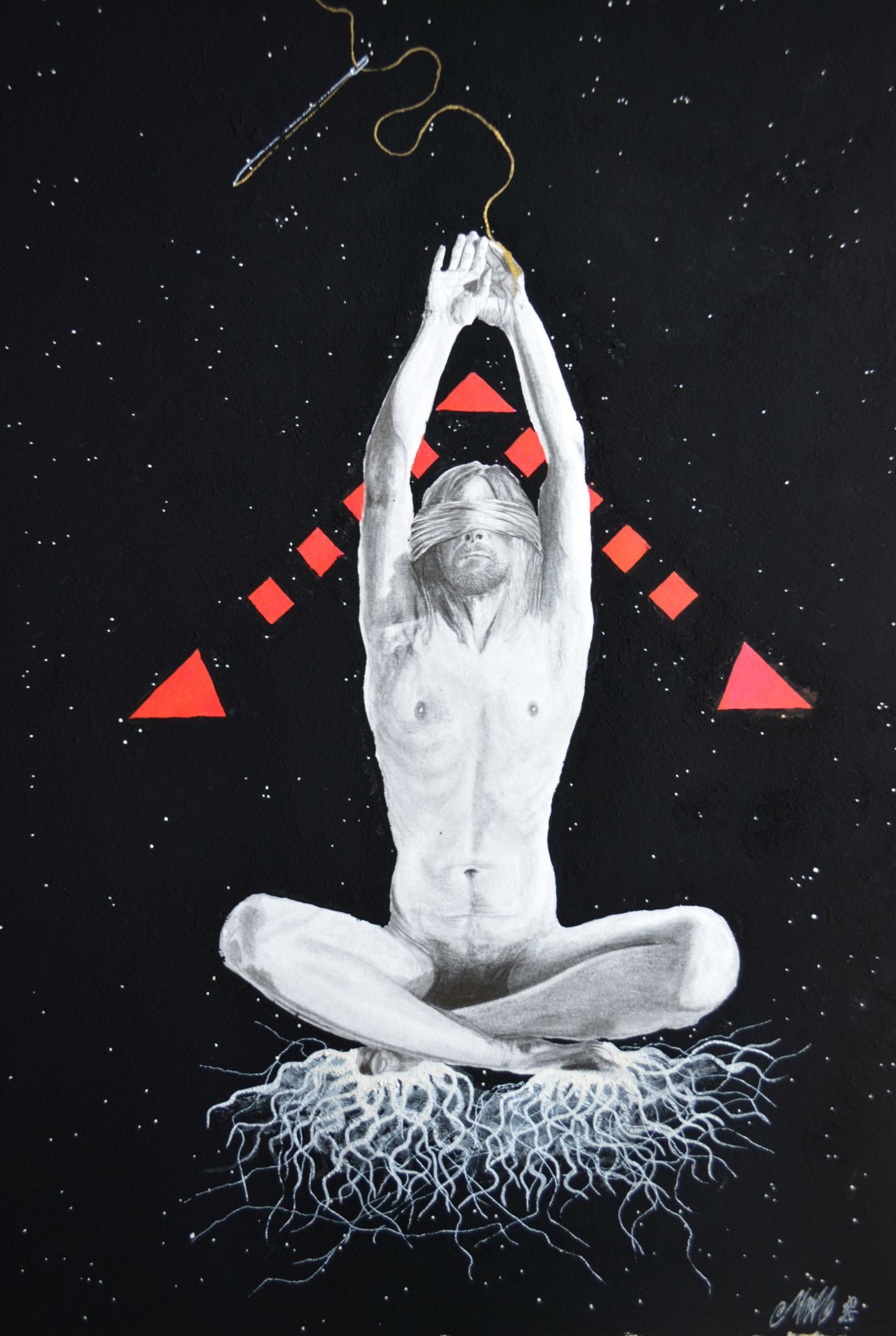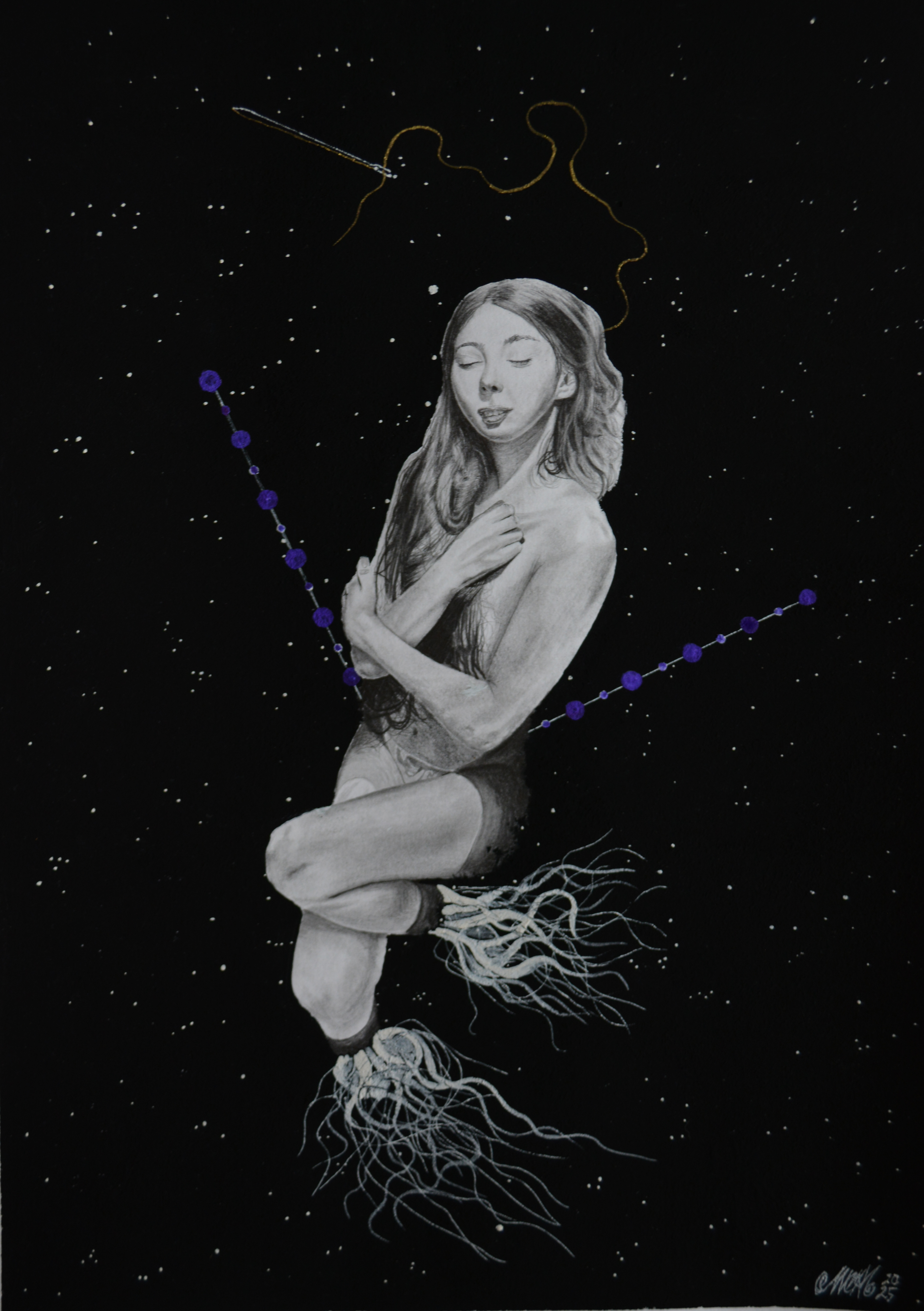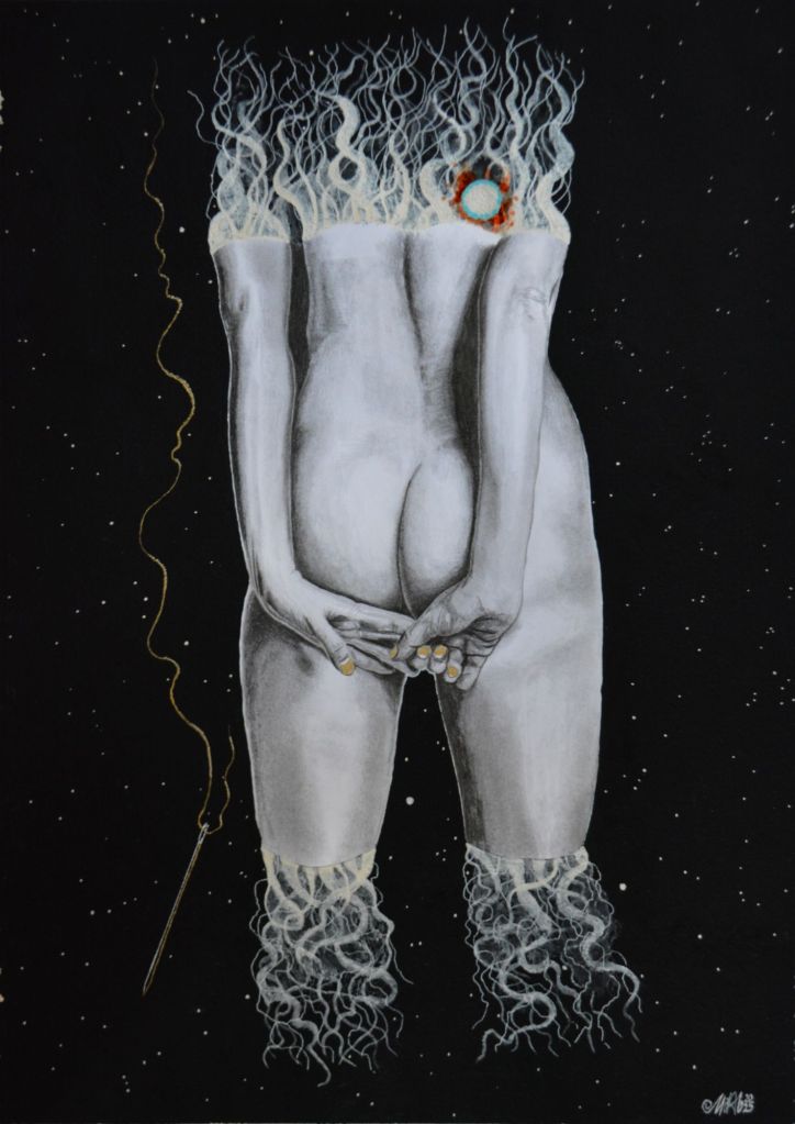 Lápices 4H, B, 3B, 8B, cartulina, pintura acrílica y acuarela, tinta roja, musou 99,4%, aguja y hilo. 40X30cm 2025